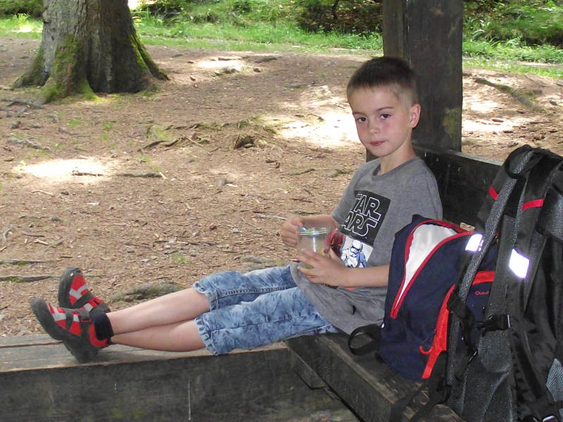 Hier komt de rivier de 'Hoëgne' uit de Hoge Venen, en is er een open plaats. De zon toont zich van z'n beste kant, waardoor Tristan en Odin hun zwembroek aantrekken in de rivier gaan spelen :)