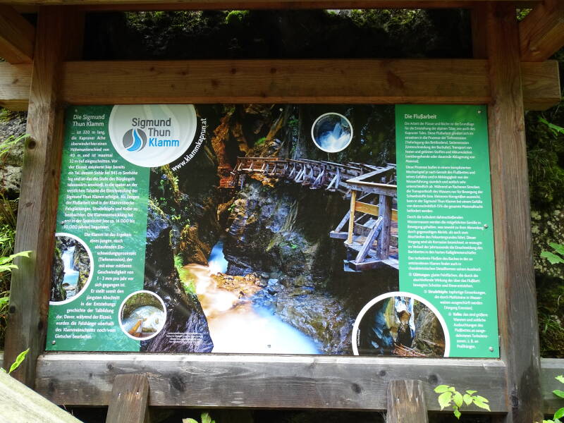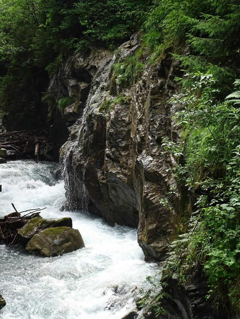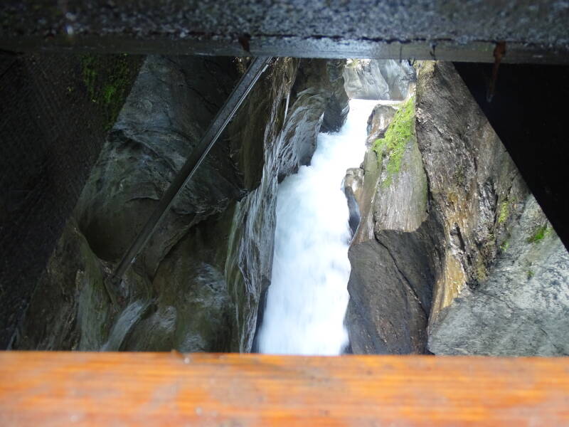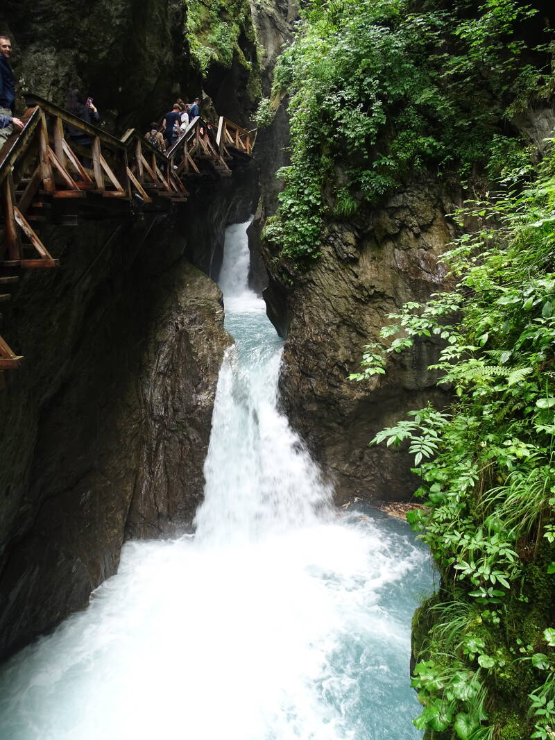 De 'Sigmund Thun Klamm' is kort maar krachtig ... Het water dondert door de nauwe kloof, terwijl we langs houten platformen lopen die aan de rotswand zijn aangebracht.