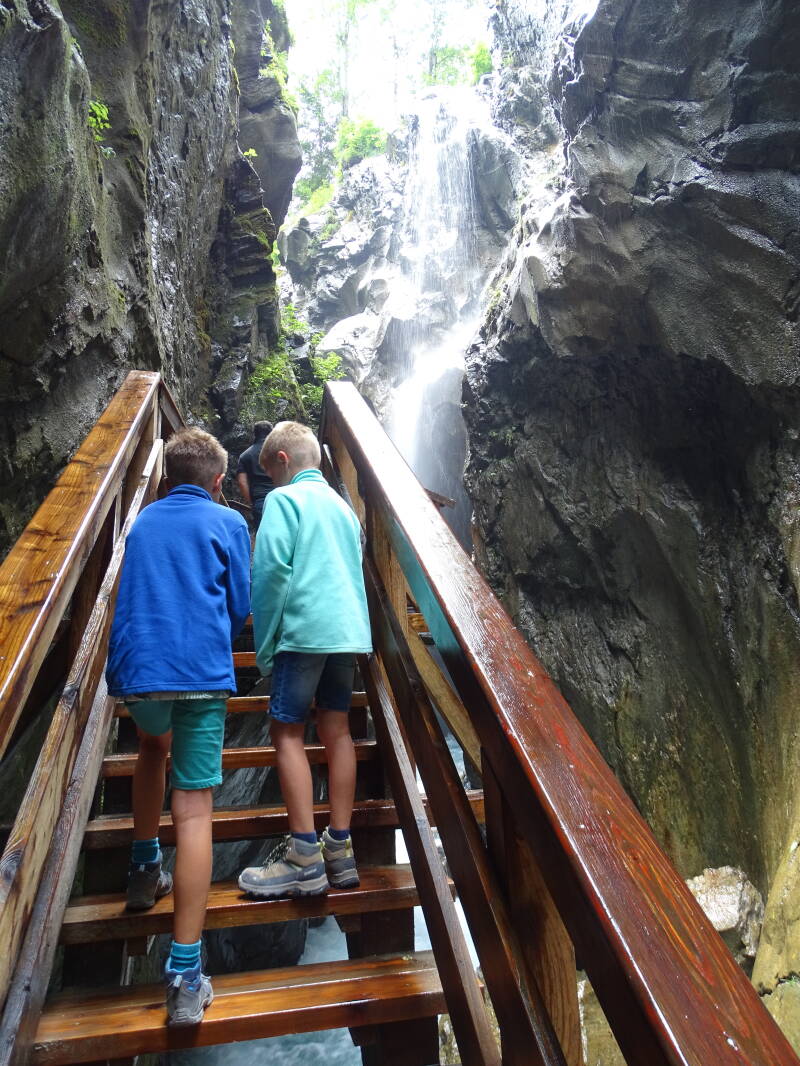 Na een half uurtje wandelen komen we aan het einde van de Klamm, waar het water vanuit het meer de 'Klammsee' via een grote waterval de kloof instroomt.