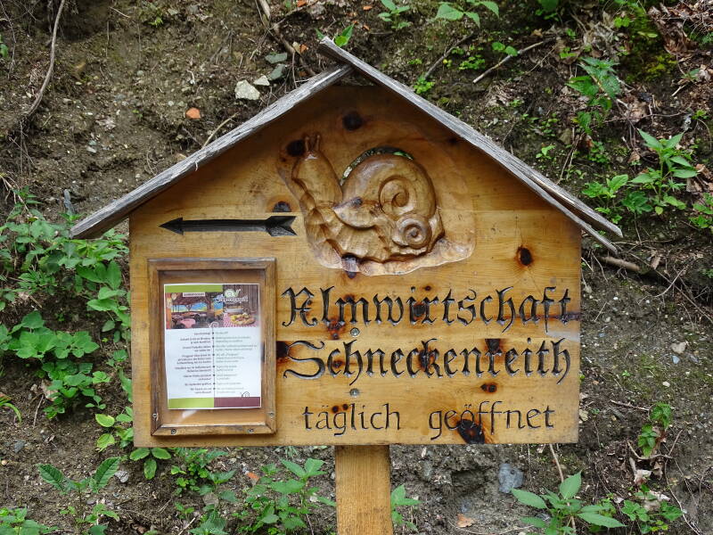 Sneller dan verwacht komen we aan bij ons doel : 'Almwirtschaft Schneckenreith'. We hebben ondertussen dorst gekregen, maar het is een drukte van jewelste op de Alm. Er is geen plaatsje vrij, en er staan zelfs nog andere mensen te wachten. We besluiten dan ook maar om onze tocht verder te zetten, ditmaal naar beneden naar de 'Klammsee'.