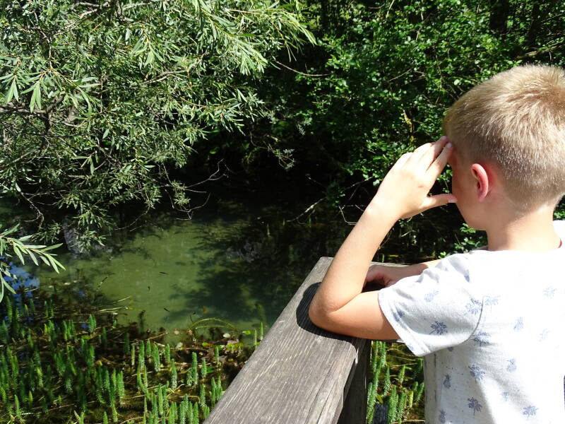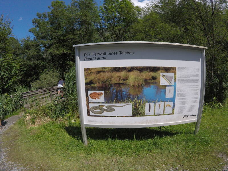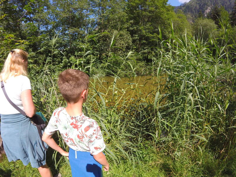 Odin wil spelen in het water, maar hier zijn we niet op voorzien. We zullen hiervoor later nog een moeten terugkeren, maar nu wandelen we rond de 'Klammsee' richting parkeerplaats. Dit is een leuke wandeling, met verschillende borden die de natuurwereld rond het meer duiden.
