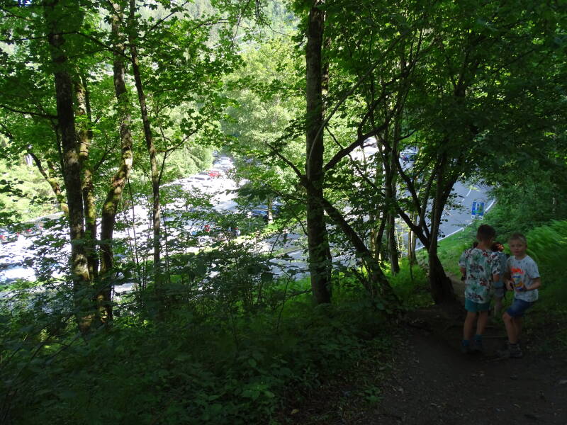 Na een kwartiertje rijden komen we aan op de parkeerplaats. Het is al druk, en met wat geluk vinden we nog een plaatsje. Hierop wandelen we richting de ingang van de Klamm.