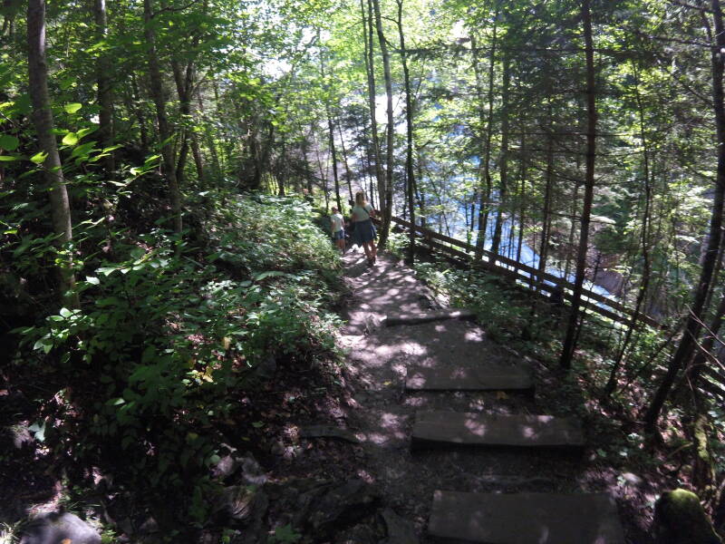 Op sommige plaatsen lopen we toch tamelijk hoog, en kan je tussen de trappen door naar beneden kijken. Alhoewel het koel is in de kloof krijgt Bjorn het tamelijk warm door zijn hoogtevrees ...
