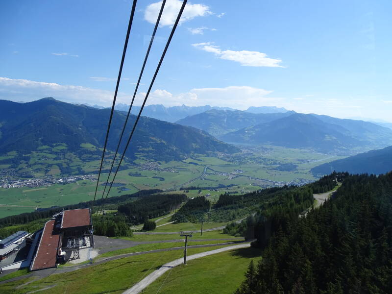 Aan de andere kant het zicht over de 'Pinzgau', met Zell am See en daaracht de bergketen 'Steinernes Meer', de 'Hochkönig', alsook de Leoganger en Löferer Steinberge ...