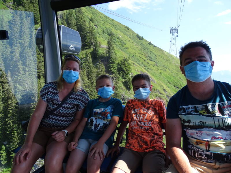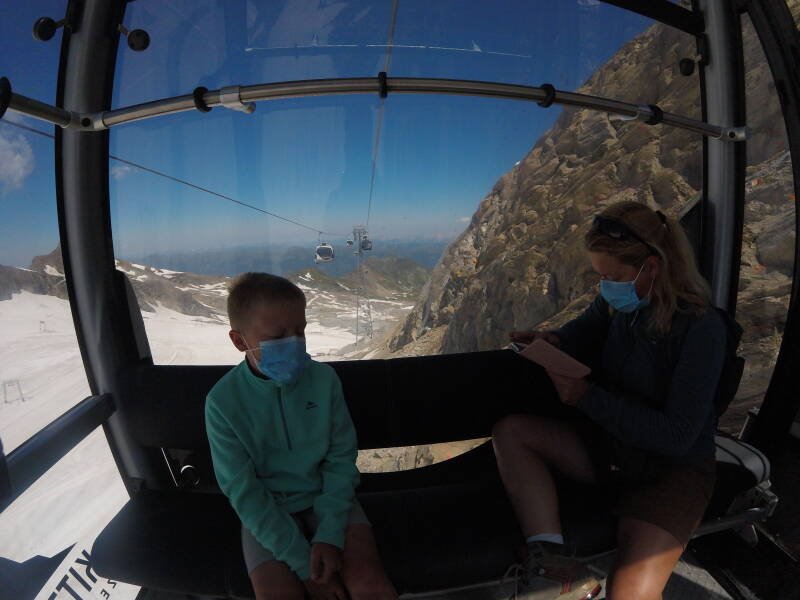Hier staan we een beetje in de wachtrij, maar iedereen heeft een mondmasker op. Iets later hangen we boven de sneeuwvelden ...