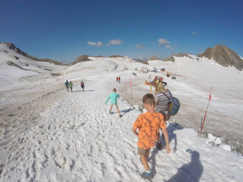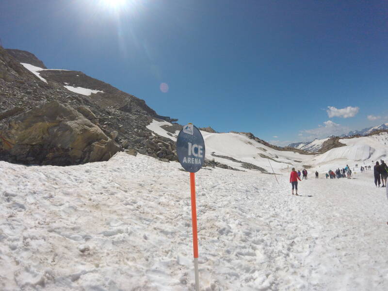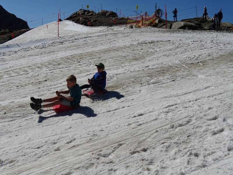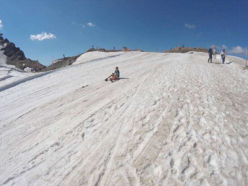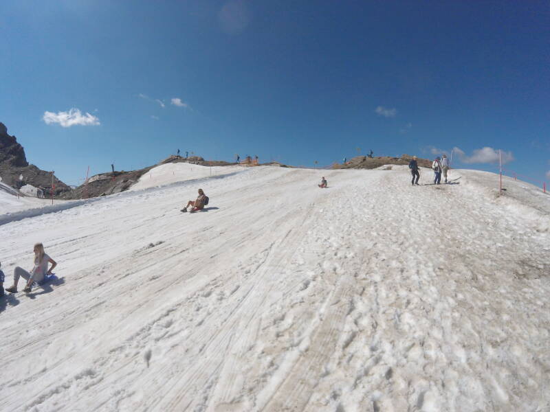 We komen zo aan bij ons de doel : het eindpunt van de kabelbanen. Hier kan je ofwel te voet ofwel met een 'tram' naar de 'Gipfelwelt 3000'. Daar is een restaurant gelegen, een uitkijkplatform, een 'Cinema 3000' en een tunnel die dwars door de berg gaat. Wij laten dit voorlopig voor wat het is, en begeven ons naar de 'Ice Arena', waar je in de zomer kan sleeën !
