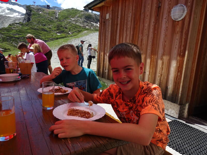 Na een kleine drie kwartier komen we aan bij de 'Krefelder Hütte'. Het is er enorm druk, maar gelukkig kunnen we nog een plaatsje bemachtigen. De kinderen doen zich tegoed aan een lekkere 'Apfelstrudel'.