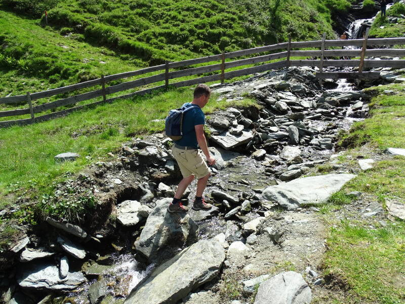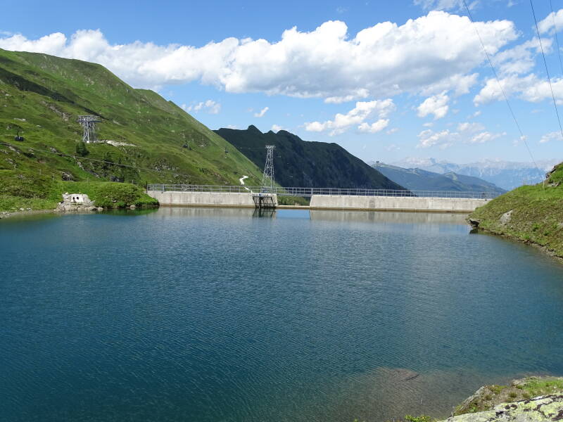 We passeren een klein stuwmeertje, en lopen vervolgens langs alpenweiden en een waterval ...