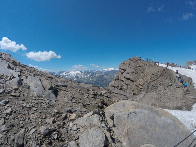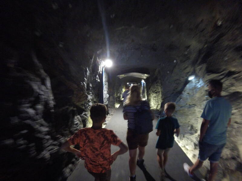 We sleeën toch wel een klein uur, waarna we besluiten om naar de 'Gipfelwelt 3000' te gaan. Te voet lijkt geen optie, gezien er nogal wat volk omlaag komt gestapt. We zullen dus de 'tram' nemen voor het laatste stukje. Hiervoor moeten we eerst een stukje door de berg, door een tunnel.
