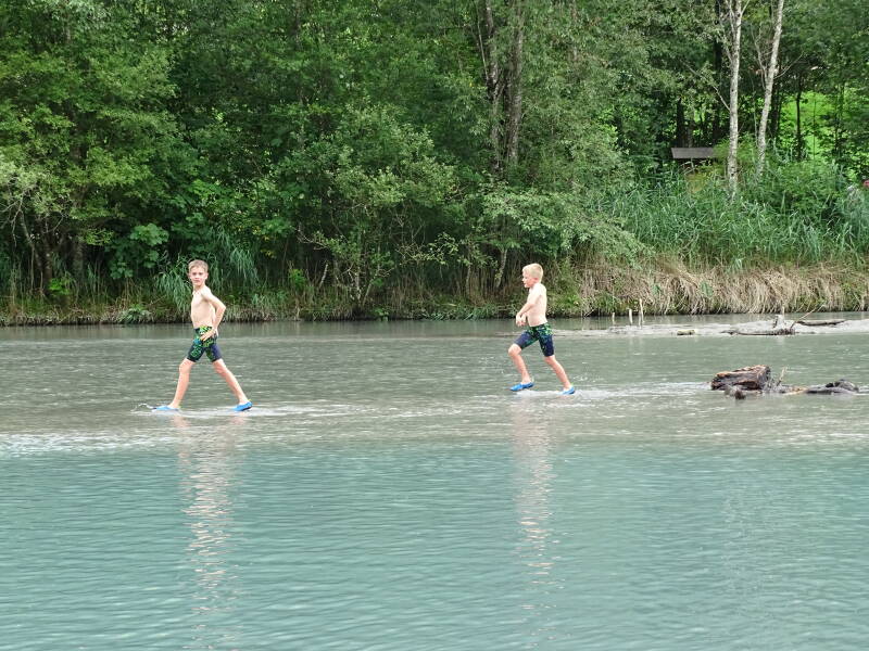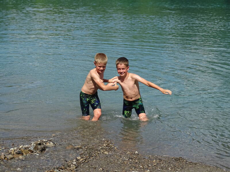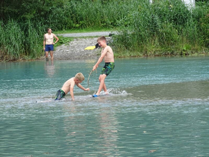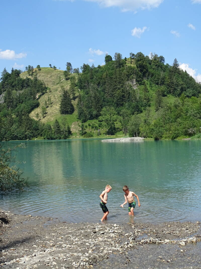 We springen weer in de auto, en tijdens het rijden naar Kaprun passeren we langs de 'Klammsee', die we al eens bezochten op onze eerste dag. Nu hebben we echter zwembroeken en waterschoenen mee, en gaan we het water in ...