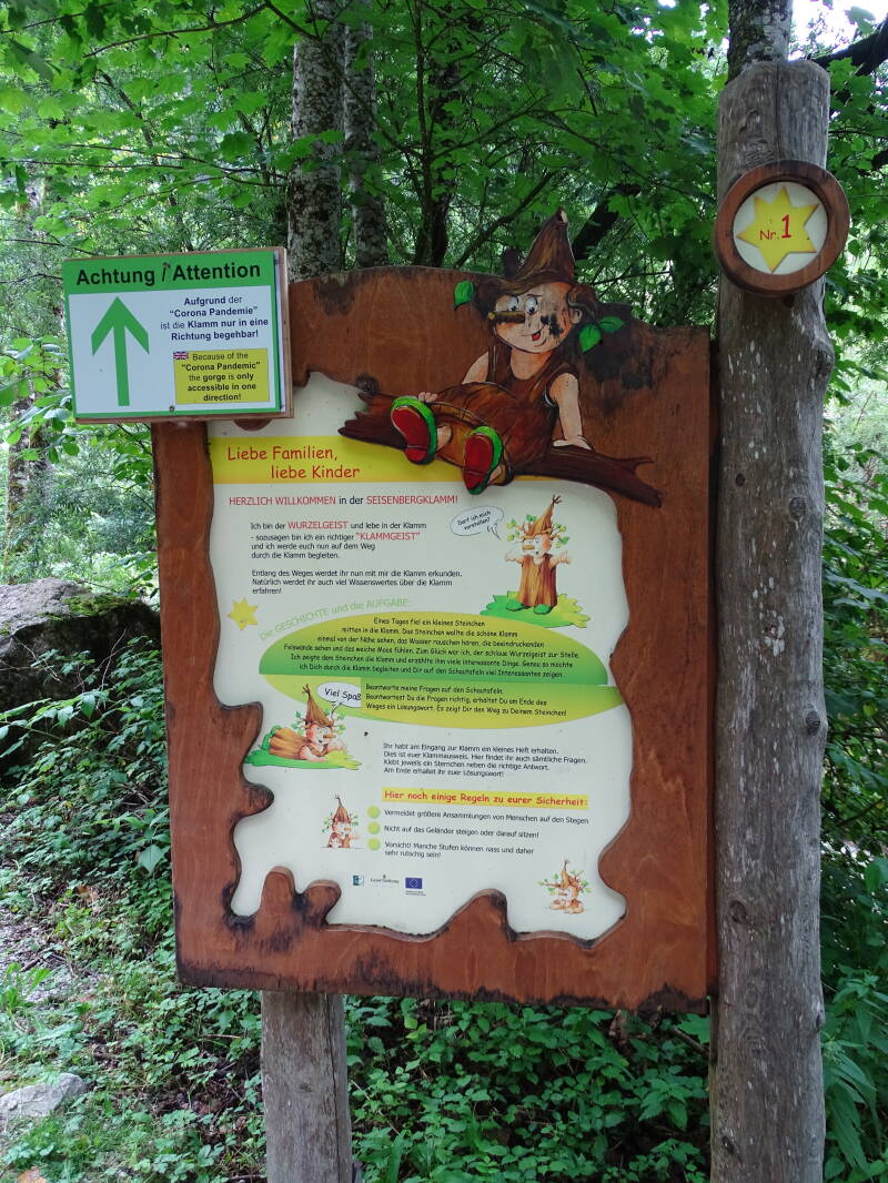 Tussen de huizen lopen we naar de ingang van de Seisenbergklamm (hier was ook parking genoeg).