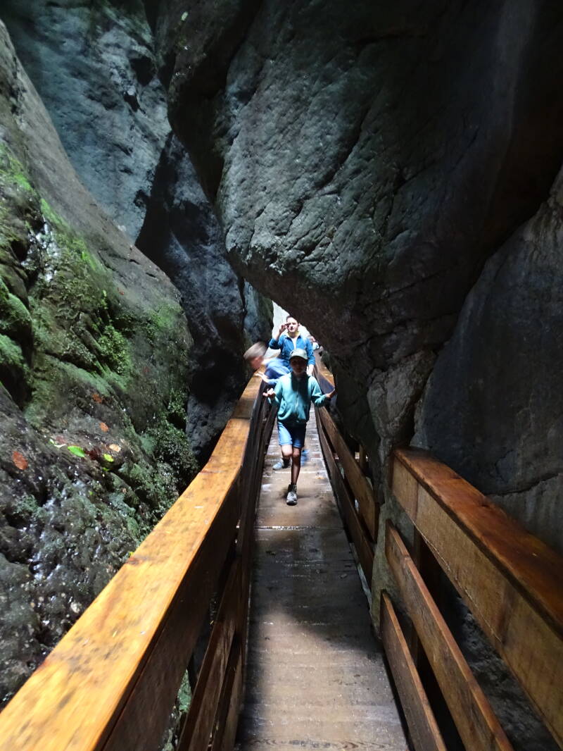 We lopen via bruggetjes en loopplanken langs rotswanden door de klamm