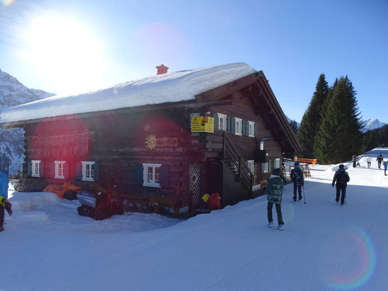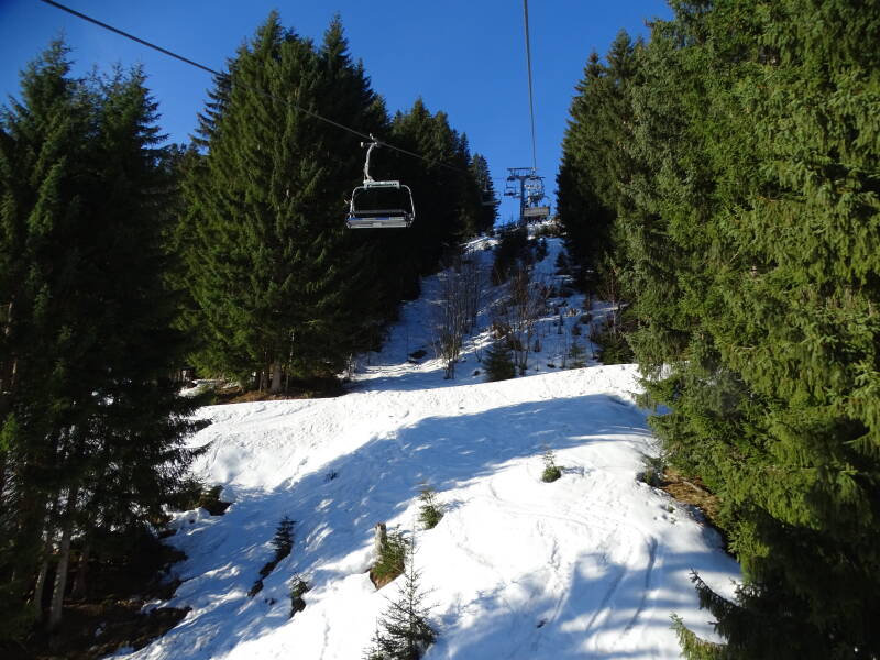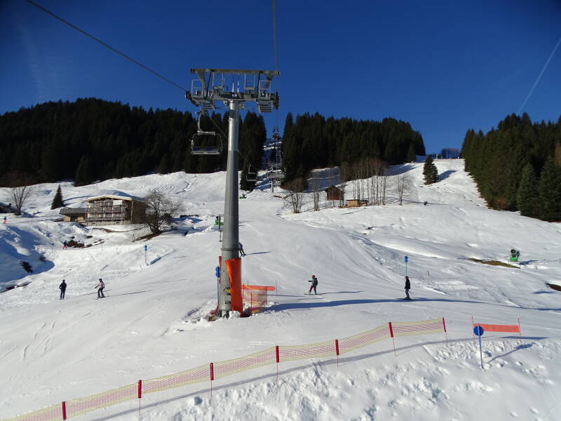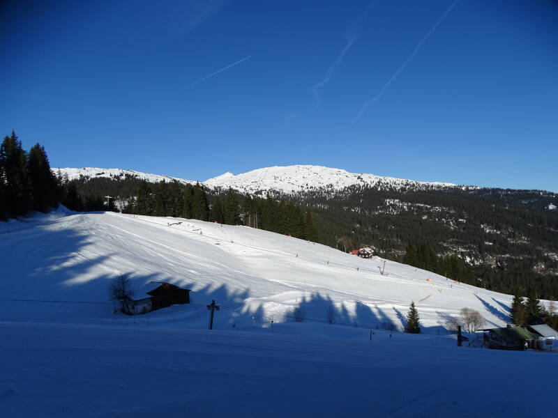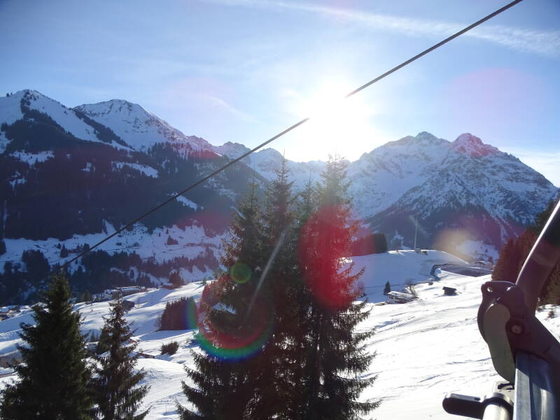 Het Kleinwalsertal ligt vol sneeuw, en vandaag gaan we de 'Baader Hohenweg' wandelen. We rijden naar het dorpje Hirschegg, en nemen - onder een stralende zon - daar de 'Heubergbahn' omhoog.