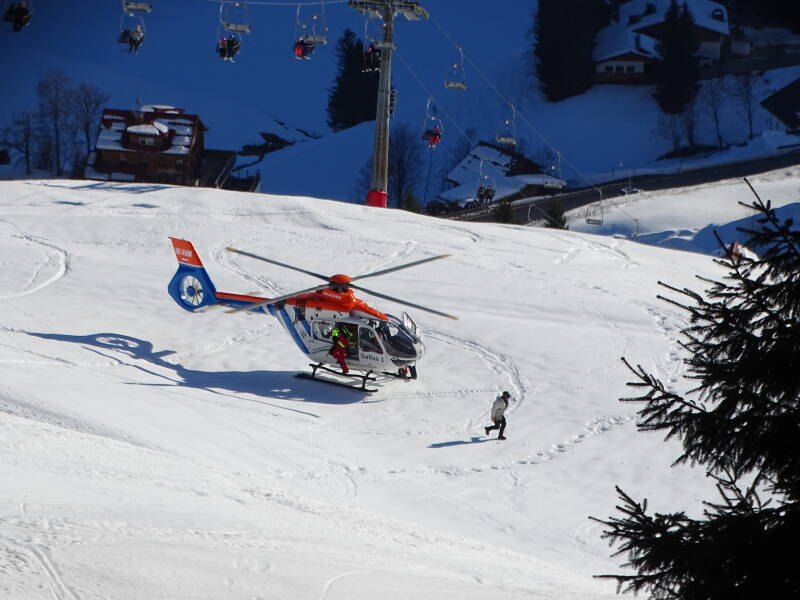 We zijn nauwelijks vertrokken of de reddingshelikopter landt ... een skiër is gevallen, en moet weggebracht worden ...