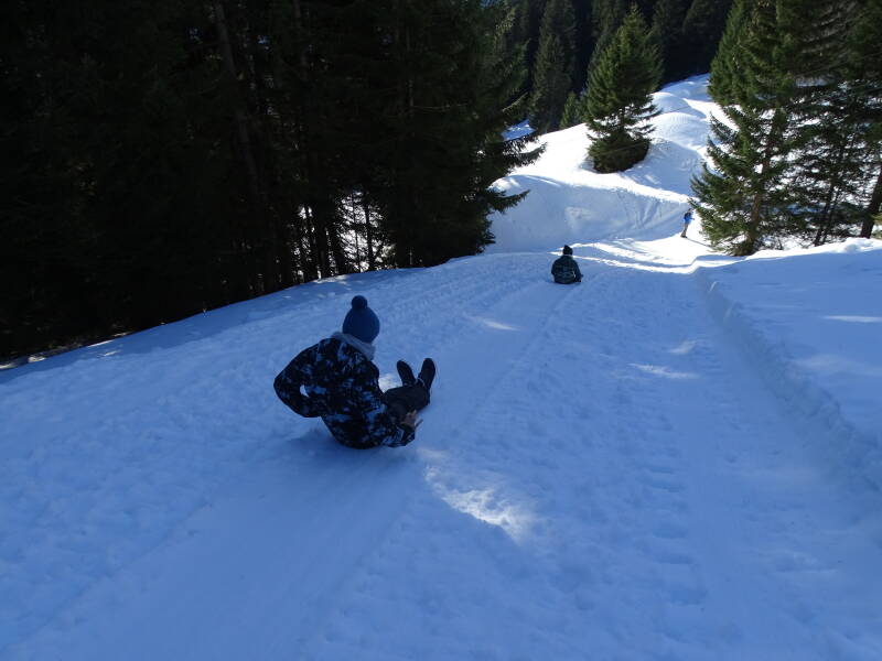 Terwijl we er wandelen skiet er een jonge vrouw vanop de piste gewoon het bos in ... gelukkig niet te snel, maar ze zit vast met haar ski's aan en rond een boom. Tesamen met een andere Nederlandse skiër helpen we de Duitse vrouw uit haar hachelijke positie ... Onze goede daad voor vandaag zit er alweer op !