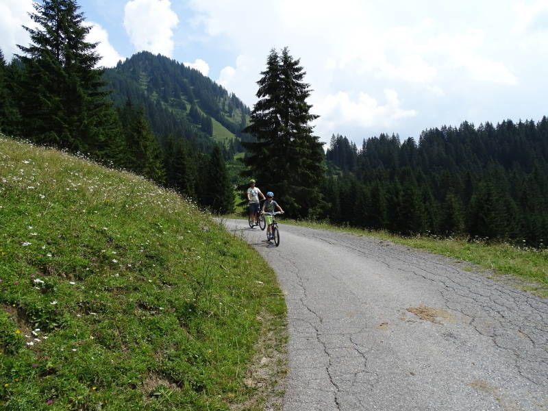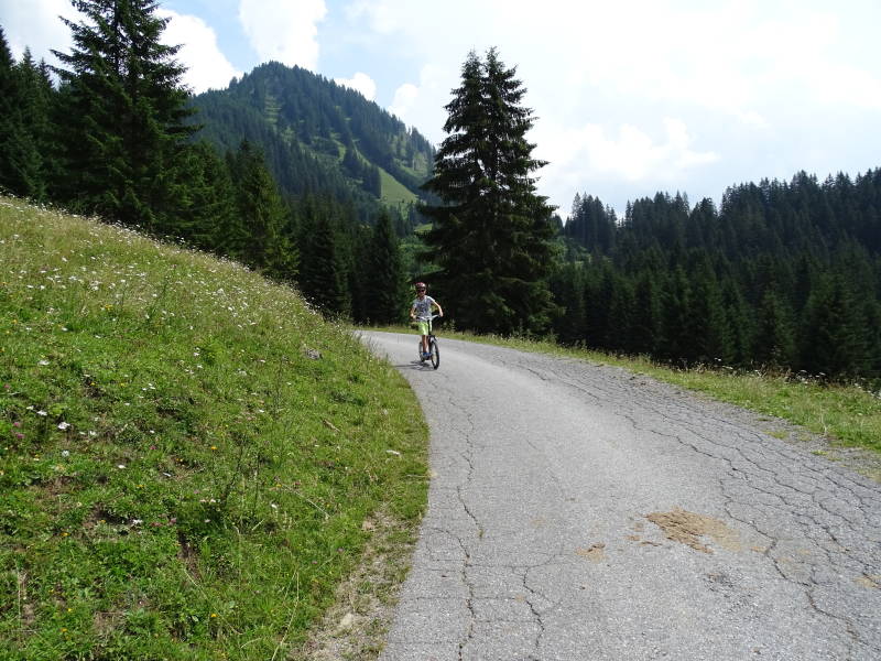 Het is een beetje wennen aan de bergroller (Tristan en Odin vinden het aanvankelijk moeilijker dan verwacht), maar éénmaal we van de grindpaadjes op asfalt komen zijn we het allemaal gewend, en is het genieten geblazen !