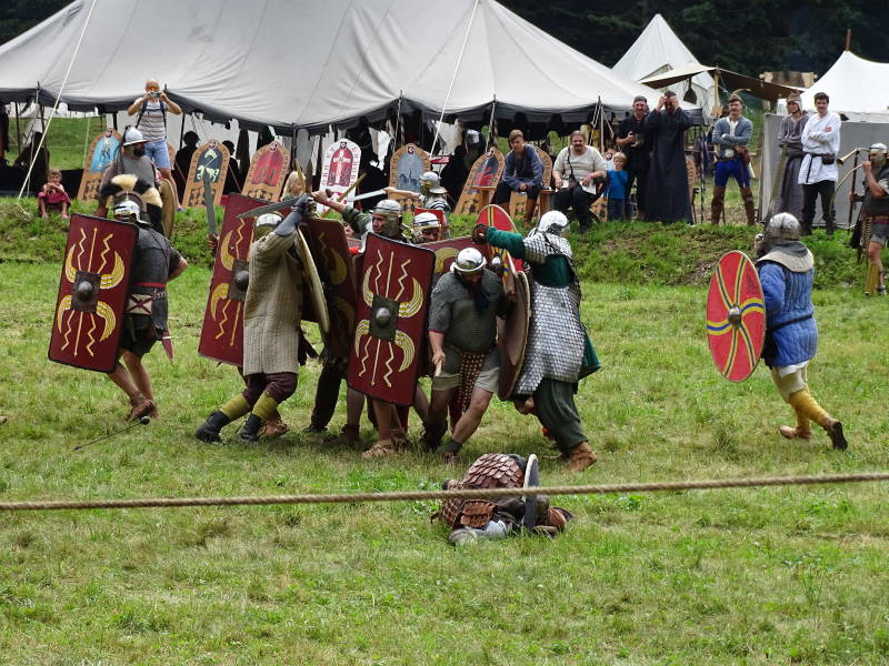 Er is ook een gevecht tussen Romeinen en barbaren.
