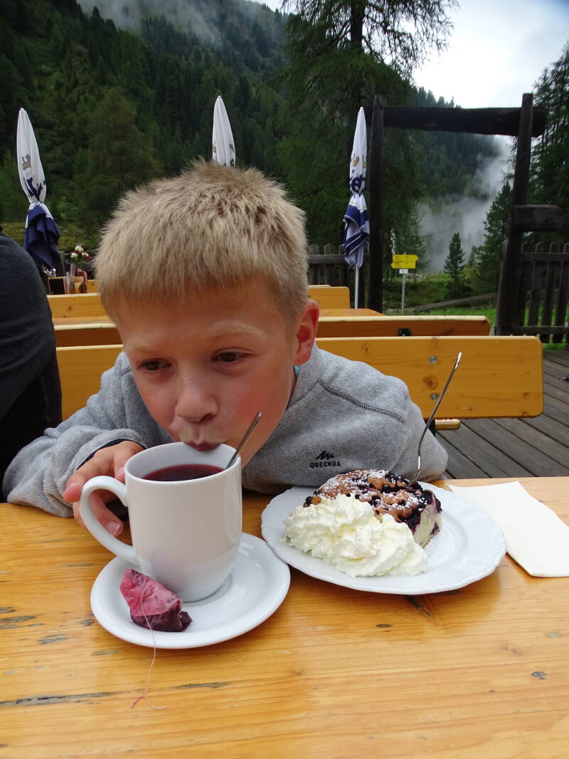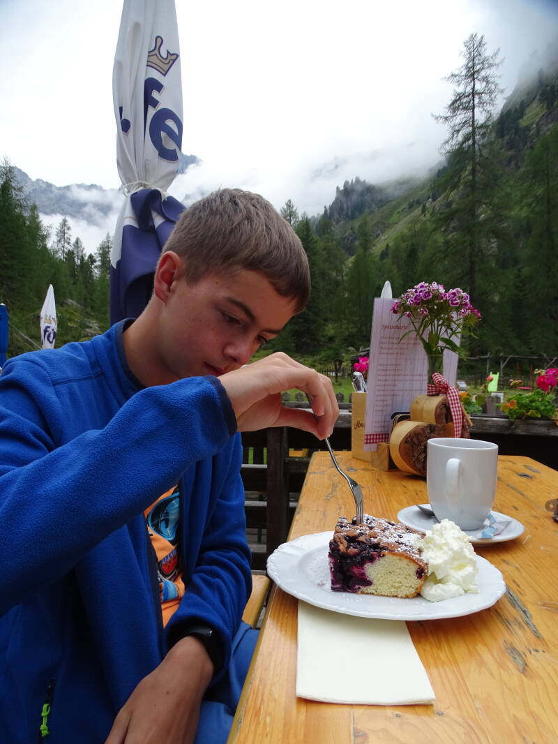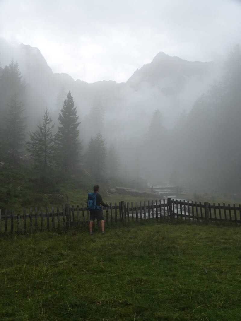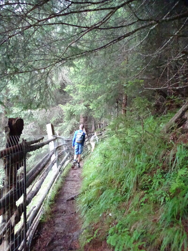 Gezien we te laat waren om op de dinsdag een gratis rit te boeken met de almbus naar de Tiefentalalm, moeten we er te voet naartoe. Dit wordt ons doel voor vandaag. Het weer is niet super, maar we willen de alm zien en ook de broodnodige laatste punten bijeenstappen voor onze Wandernadel.