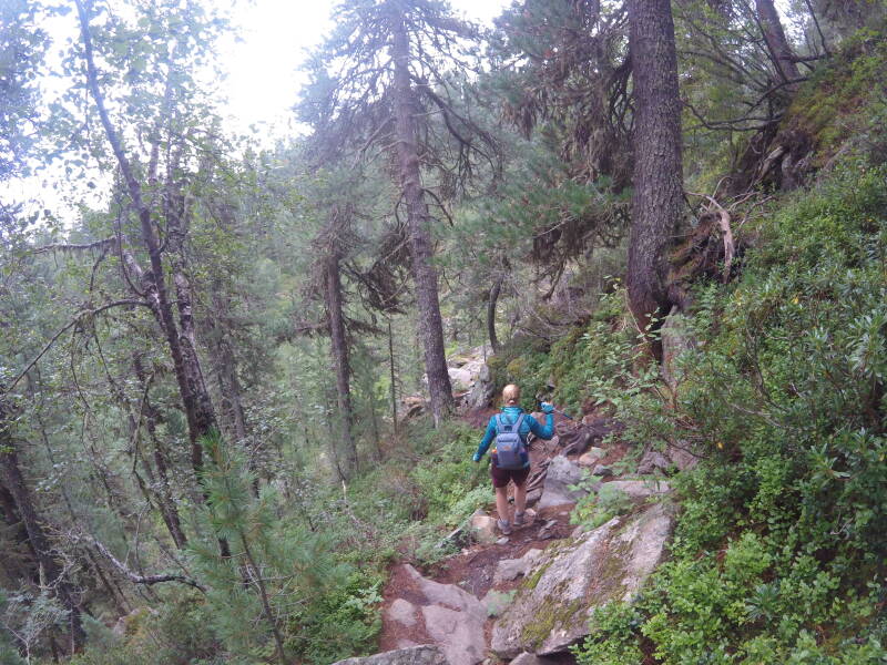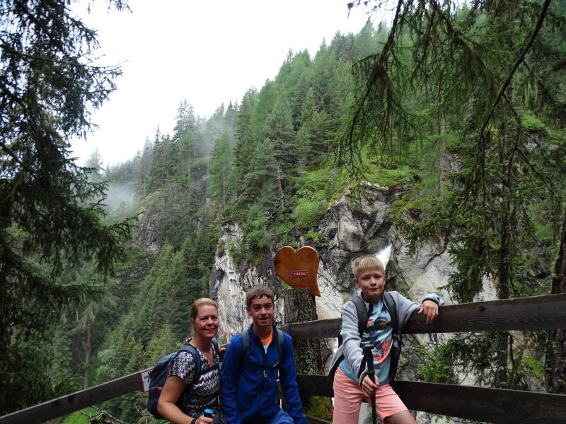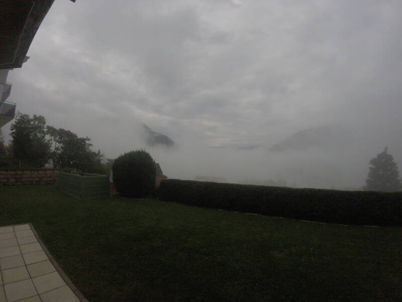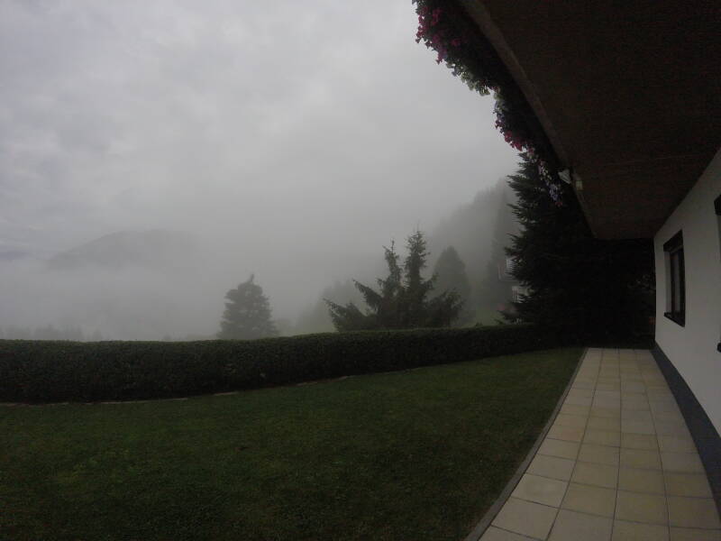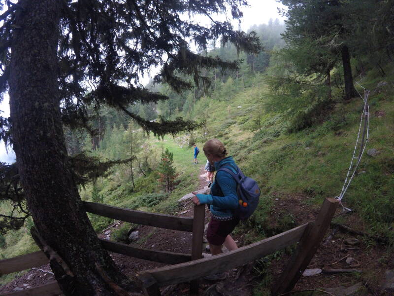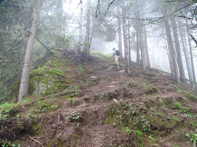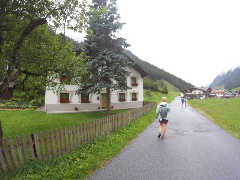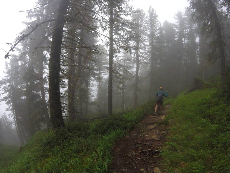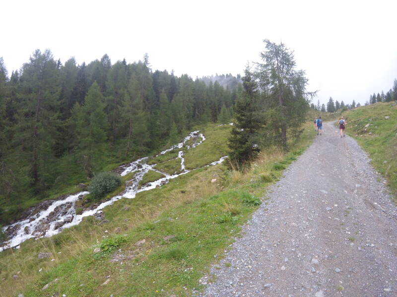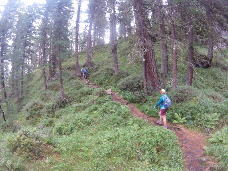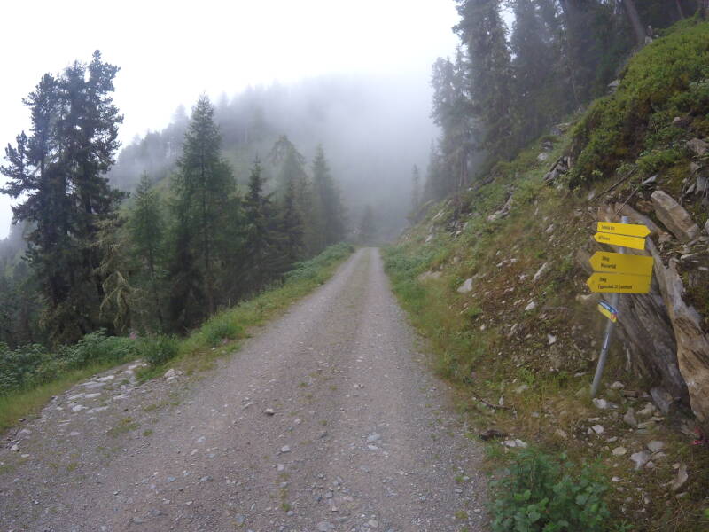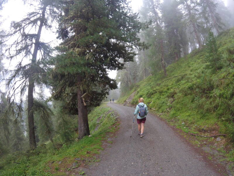 We wandelen nu via de brede 'forstweg' omlaag. Jammer genoeg zitten de bergen aan de overzijde van het 'Pitztal' in de wolken ...