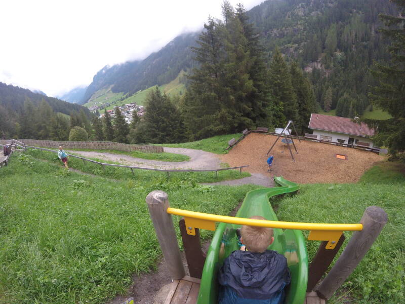 Odin wil nog graag eens van de glijbaan daar. Zijn gele broek heeft het geweten ...