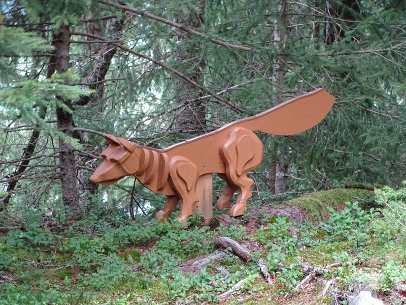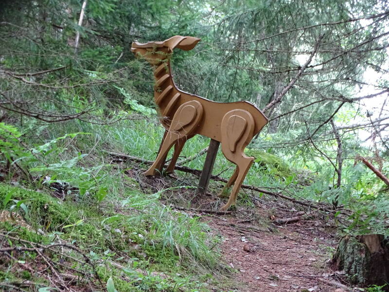 Hierna zetten we verder, en komen we verschillende houten standbeelden van alpendieren tegen. Sommige moet je ook zoeken want ze zitten verstopt :)