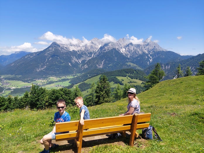We komen aan rond de middag in Tirol, Oostenrijk. Het is mooi weer, en we besluiten om met een berglift naar de 'Buchensteinwand' naar boven te gaan, en vandaaruit terug naar beneden te wandelen.