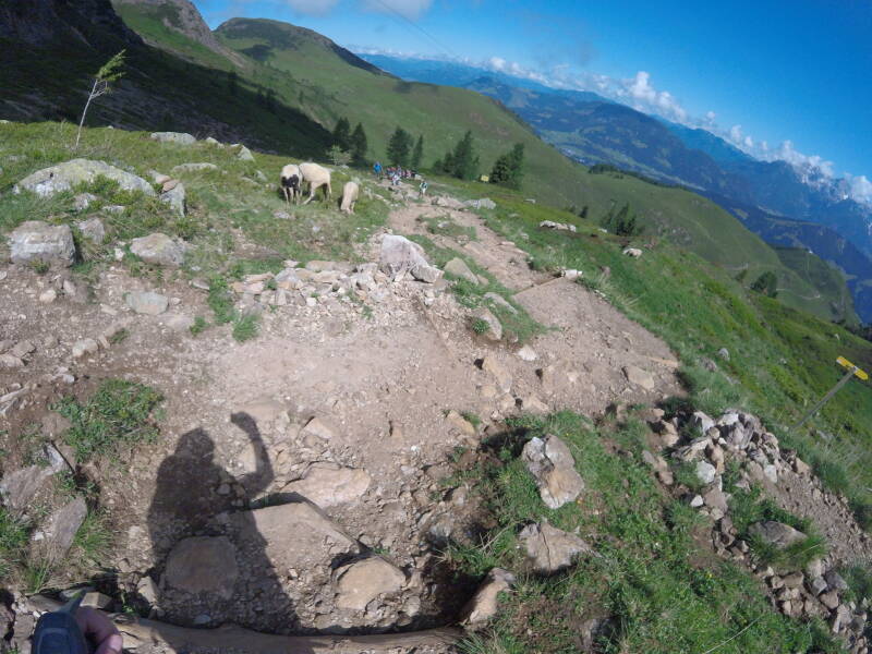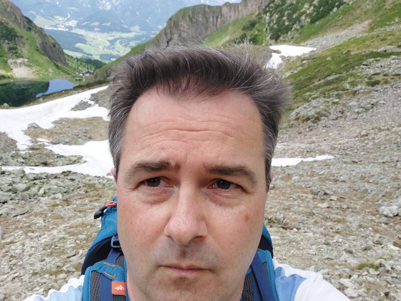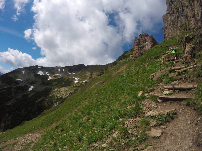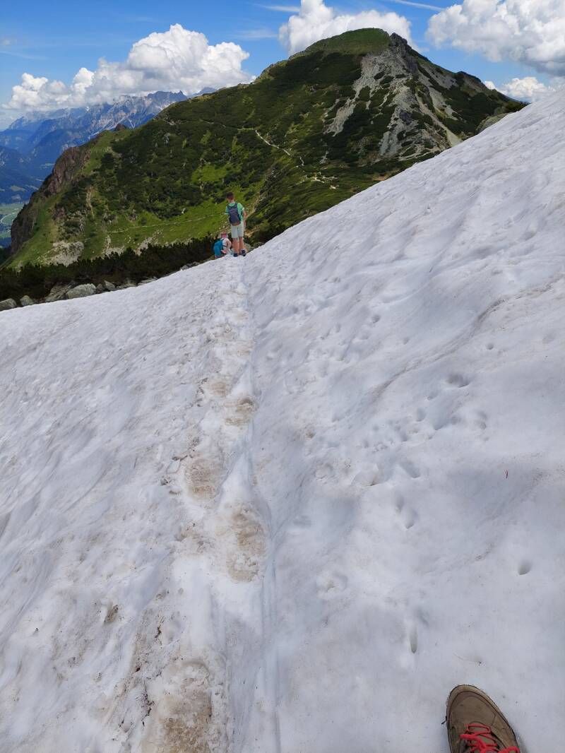 Bjorn moet even langs een 'jochl', met langs beide kanten relatief steile hellingen omlaag. Voor normale mensen geen probleem, maar voor Bjorn met z'n hoogtevrees is het een nieuwe beproeving vandaag ...