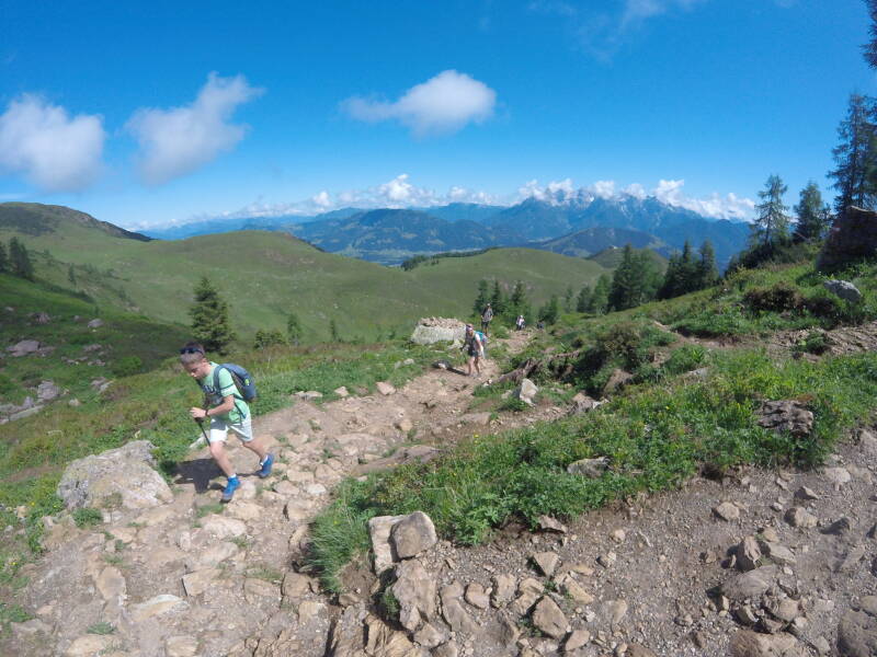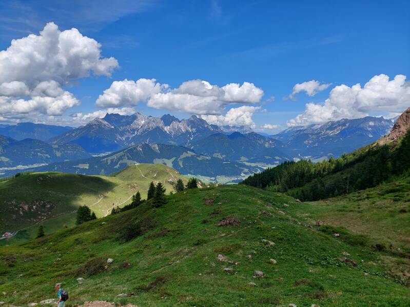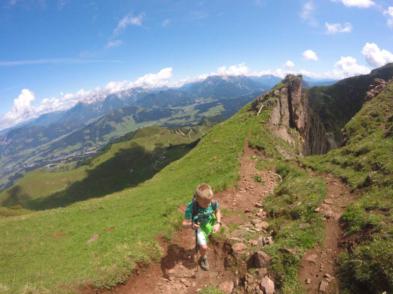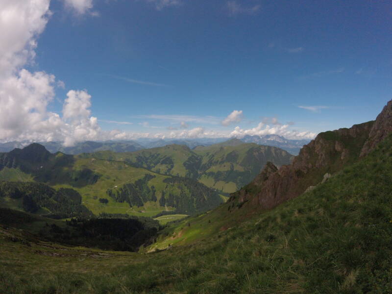 Eénmaal Bjorn voorbij de 'jochl' is kan hij een beetje ontspannen ... er is een mooi zicht op de achterkant van de groene grasbergen nabij Kitzbühel. In de verte zijn zelfs de 'Kitzbüheler Horn' en de 'Wilder Kaiser' zichtbaar.