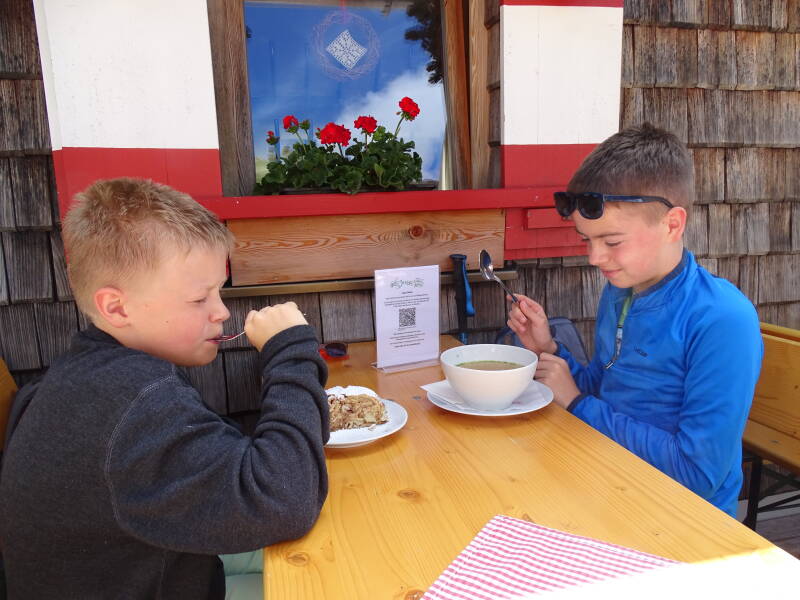 We bemachtigen een vrije tafel op het terras, en doen ons tegoed aan soep (Tristan en Ilona), Apfelstrüdel (Odin) en een frisse 'Almdudler' (Bjorn).