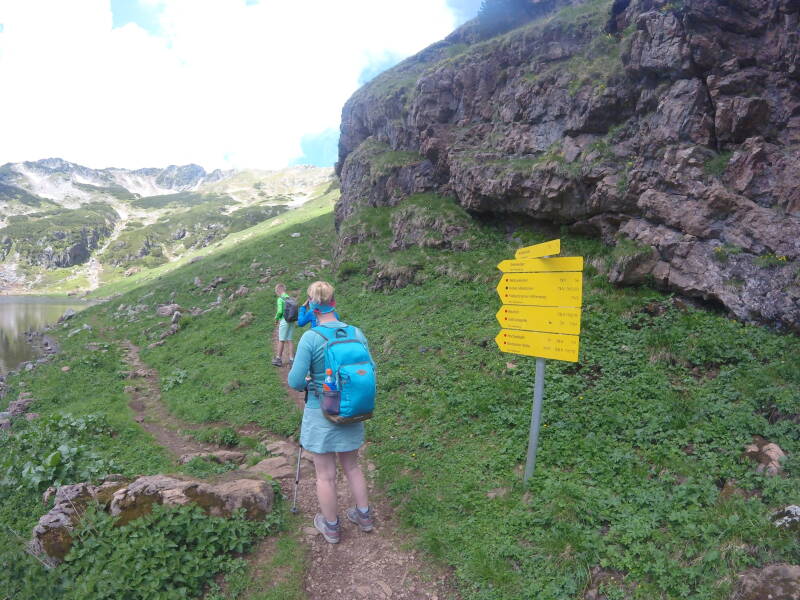 Je kan rond het meer wandelen, maar ons doel is vooreerst de berg de 'Wildseeloder'. De gekende gele bordjes tonen ons de weg.