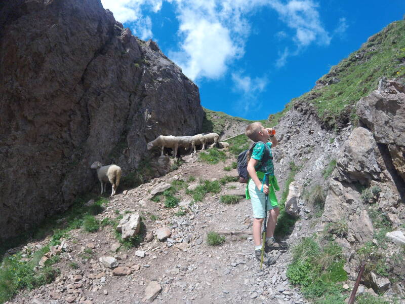 We volgen de rotswand, waarbij we een stuk verder tussen twee rotswanden door moeten. Hier staan er opnieuw schapen, witte deze keer !