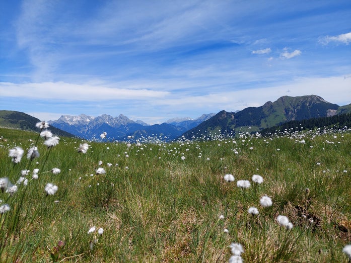 Het uitzicht op het dal naar de 'Thurnpass' (die de verbinding vormt tussen de Kitzbüheler Alpen en het Salzachtal) met daarachter de sneeuwbergen van de 'Hohe Tauern' is prachtig ...