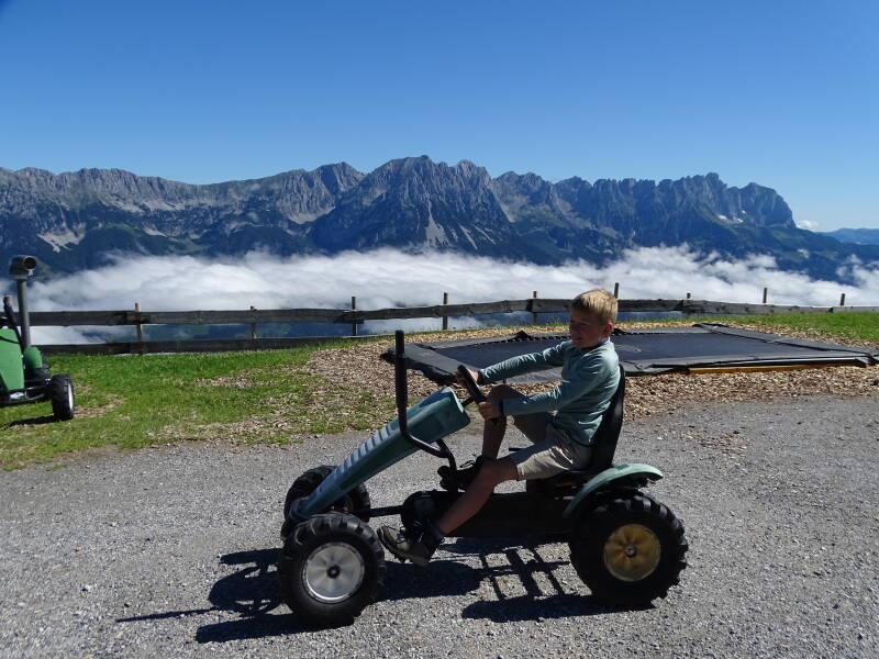 Waarna we aankomen bij het grote speelplein onderaan het bergstation 'Hartkaiser'. Hier eten we ons middagmaal op met zicht op de 'Kitzbüheler Alpen' :)
