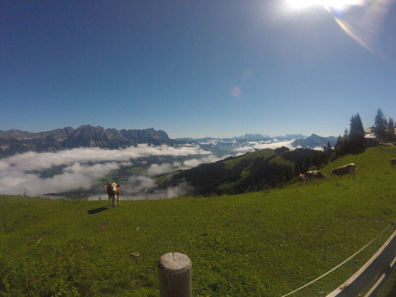 Enkele koeien genieten van de ochtendzon waarbij de 'Wilder Kaiser' boven de wolken uitkomt ...
