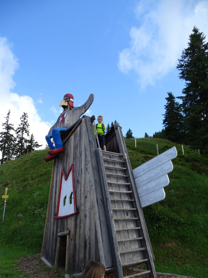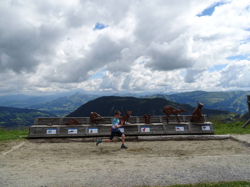 Hier is vanalles te doen voor de kinderen : even ver springen als Alpendieren, kijken hoe snel je de 100 meter kan lopen, …. en erbovenop andermaal een prachtig uitzicht over de omringende Kitzbüheler Alpen.
