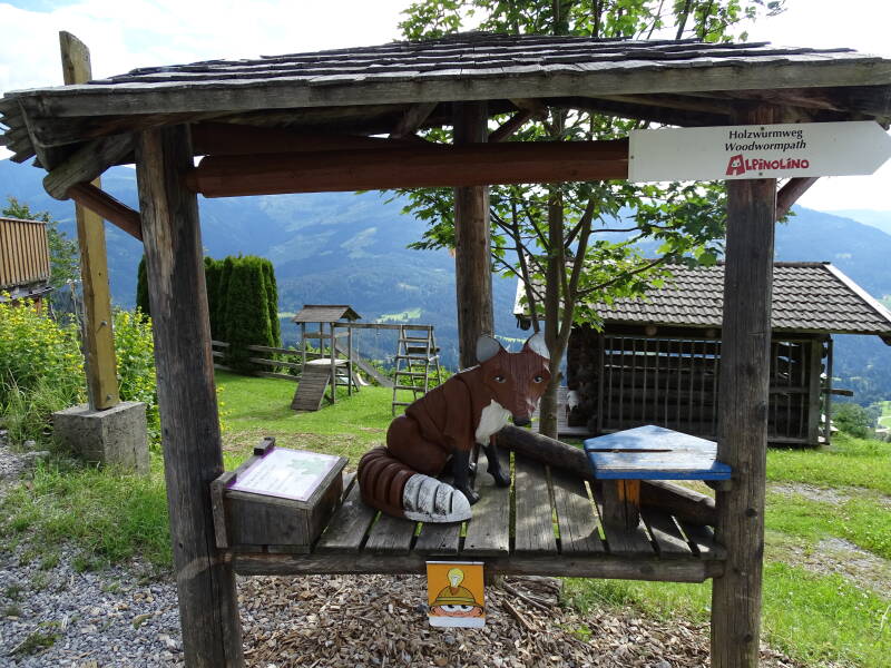 Hier beginnen we aan het laatste deel van onze dagtocht, namelijk de 'Holzwurmweg' van het middenstation naar het dalstation. Onderweg komen we houten beelden tegen van Alpendieren, en moeten we raadsel oplossen. Het Alpenlandschap maakt plaats voor bossen, weiden en riviertjes.