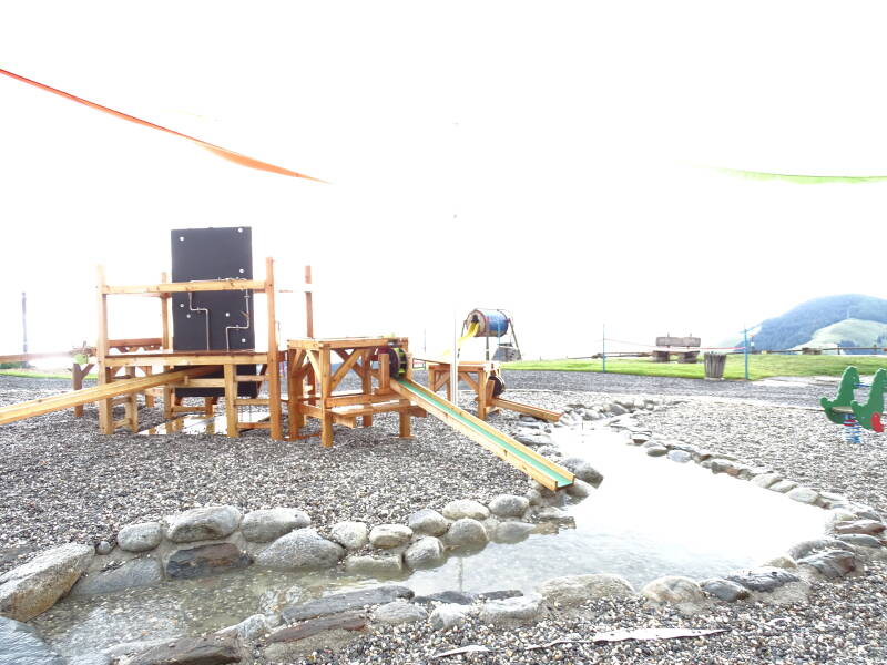 Na een warme chocolademelk zijn we opgewarmd, en in de motregen zetten we verder naar 'Ellmi's Toverwereld', een soort sprookjesbos op de berg.