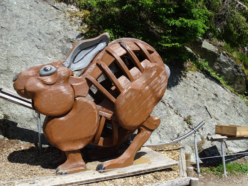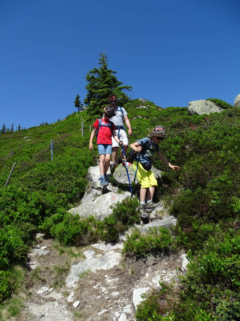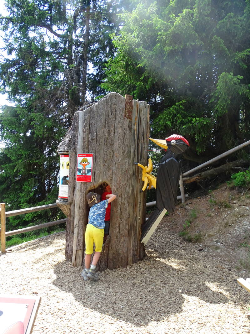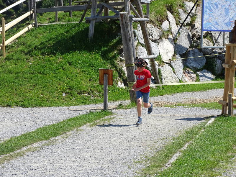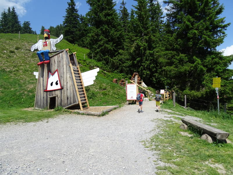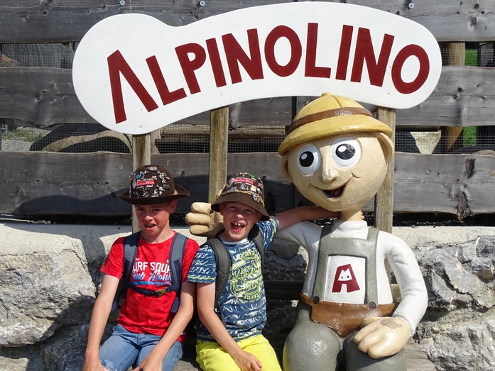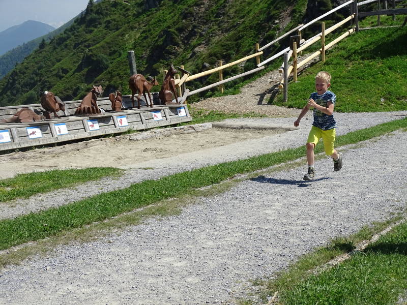 Daar komen we aan bij de gekende kinderwandeling 'Alpinolino', die we vorig jaar deden. Nu besluiten we om vooreerst de top te beklimmen, en dus eerst te wandelen en dan pas te gaan spelen. Tristan en Odin wijzen al de 'Gampenkogel' aan !