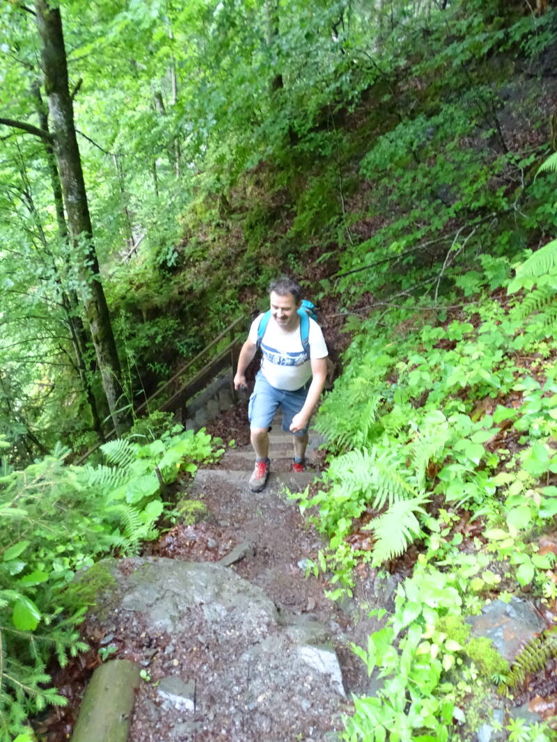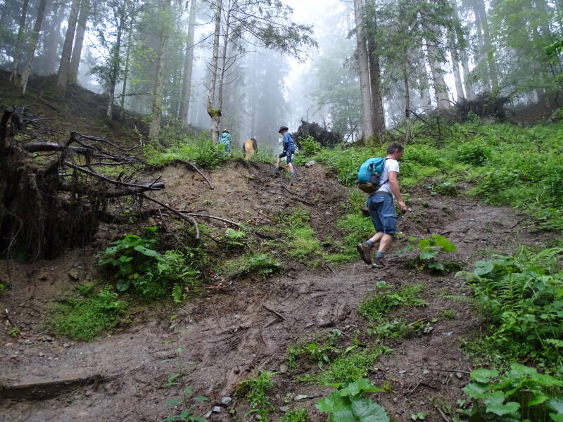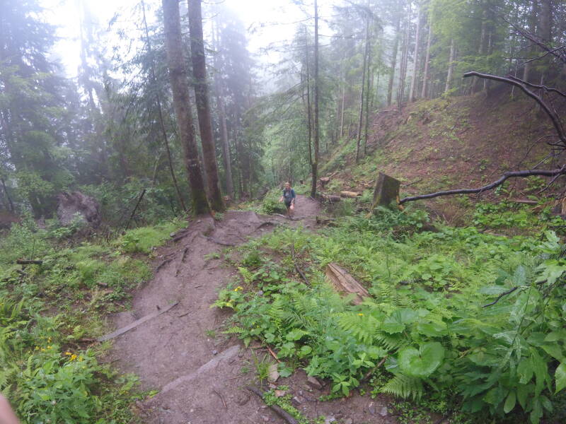 Gevolgd door een steile klim temidden van het mistige bos ...