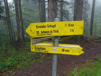 We parkeren ons iets buiten het centrum van St. Johann in Tirol (Dekan Ritterweg) op een parking langs de baan. Een wegwijzer toont ons het begin van de wandeling.