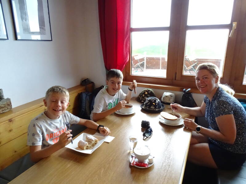 We beginnen flink door te stappen. We voelen de eerste regendruppels juist als we bij de 'Pengelstein' komen. We gaan vlug naar binnen, waarna het warempel begint te hagelen buiten !! Gelukkig genieten we binnen in het restaurant van warme soep en 'Apfelstrudel !