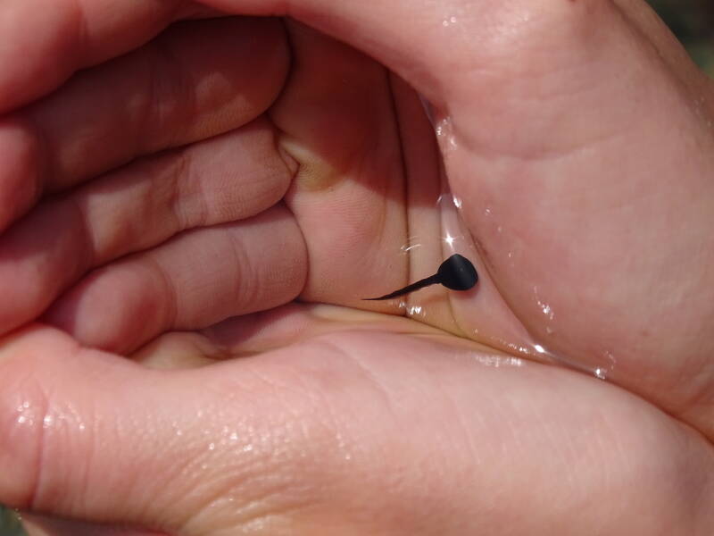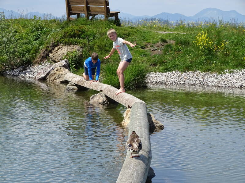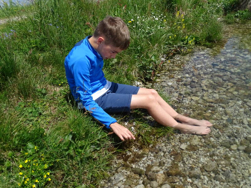Het zonnetje is weer tevoorschijn gekomen, waarbij Tristan en Odin wat spelen in het water (vol kikkervisjes), dat goed doet aan onze voeten ...