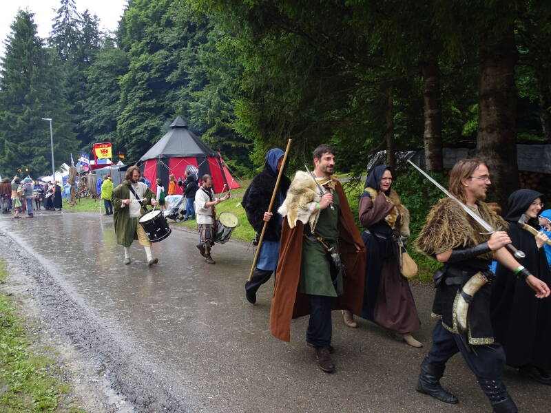 Het motregent nog steeds een beetje, maar het is ondertussen tijd voor de optocht van alle deelnemers aan de ritterspiele. Er volgt een bonte stoet van romeinen, barbaren, gladiatoren, ridders, kruisvaarders, samoerais, hofdames, jongleurs, vuurspuwers, …. die door alle kijklustigen toegejuicht worden !