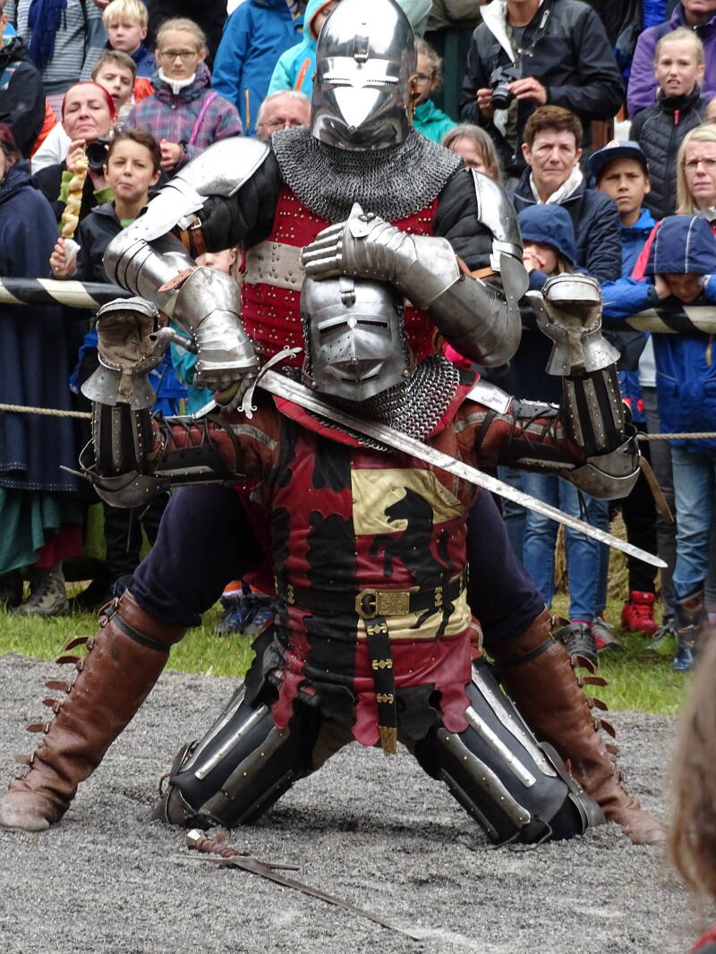 Hierna opent het festival, en waan je je in de middeleeuwen. Wij bekijken eerst het riddertornooi. Steekspelen, zwaardvechten, drama, een witte ridder (gejuich van het publiek), een zwarte ridder (boegeroep van het publiek), …. prachtig georganiseerd en prachtig geacteerd !