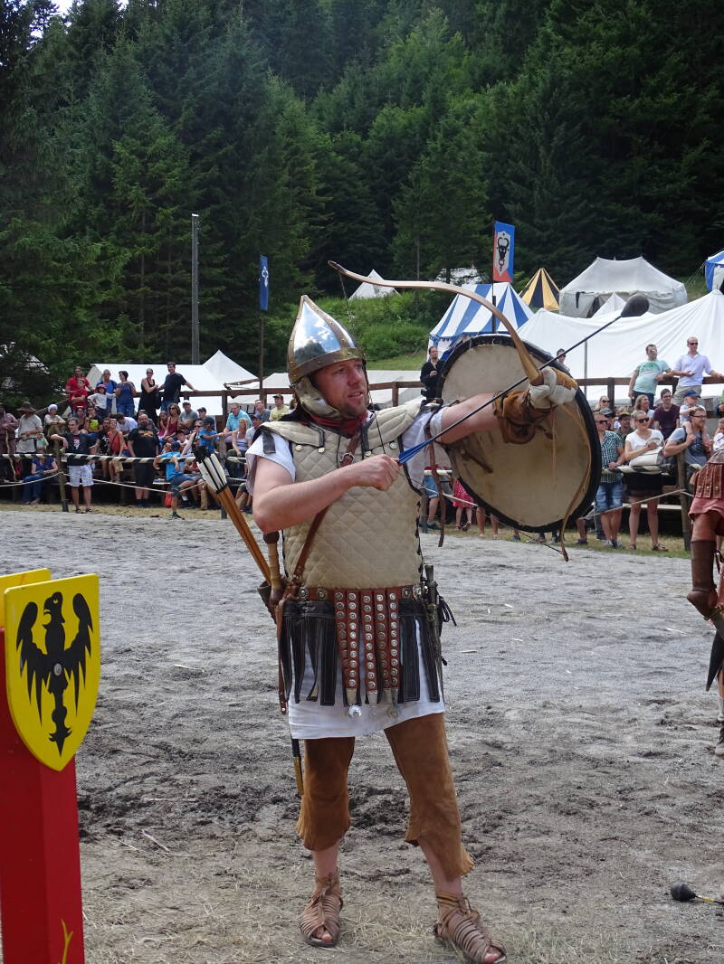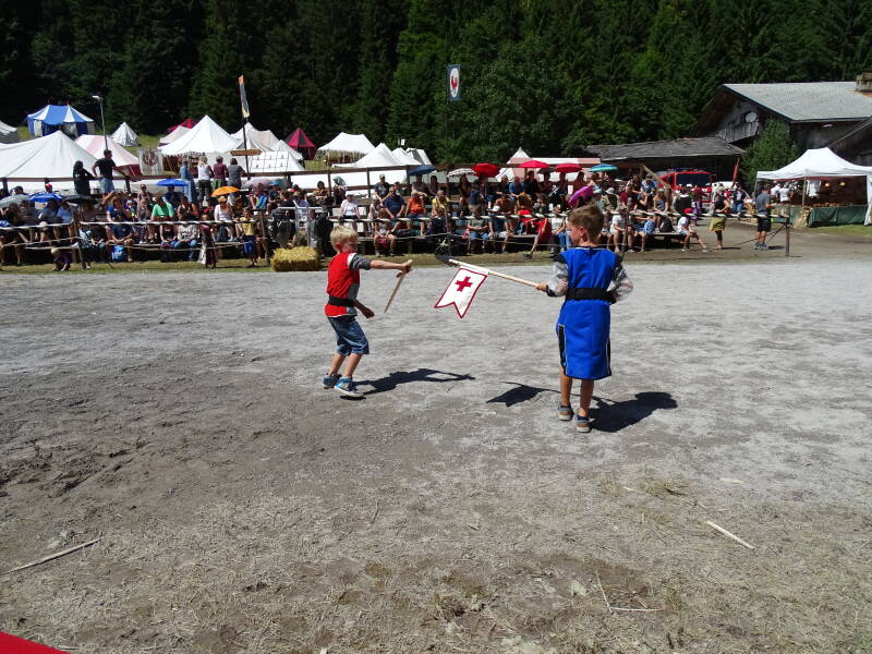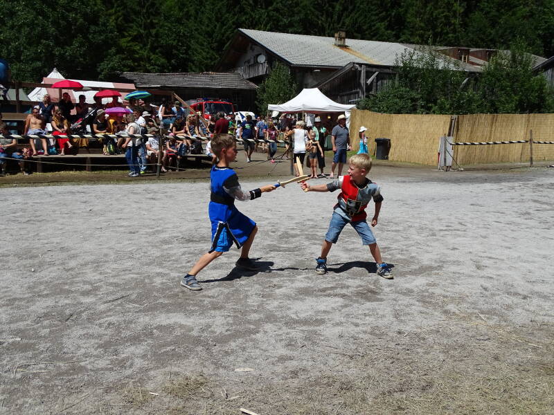 We bezoeken verder de Middelleeuwse Markt, eten bij de diverse eetstandjes, kijken nogmaals naar een riddertornooi en opnieuwe de 'Slag van Erhrenberg' (foto's op dag 4). Tristan en Odin hebben voor de gelegenheid hun riddertenue aangetrokken. Verdere attributen moeten echter door mama en papa op de Middeleeuwse Markt gekocht worden ...