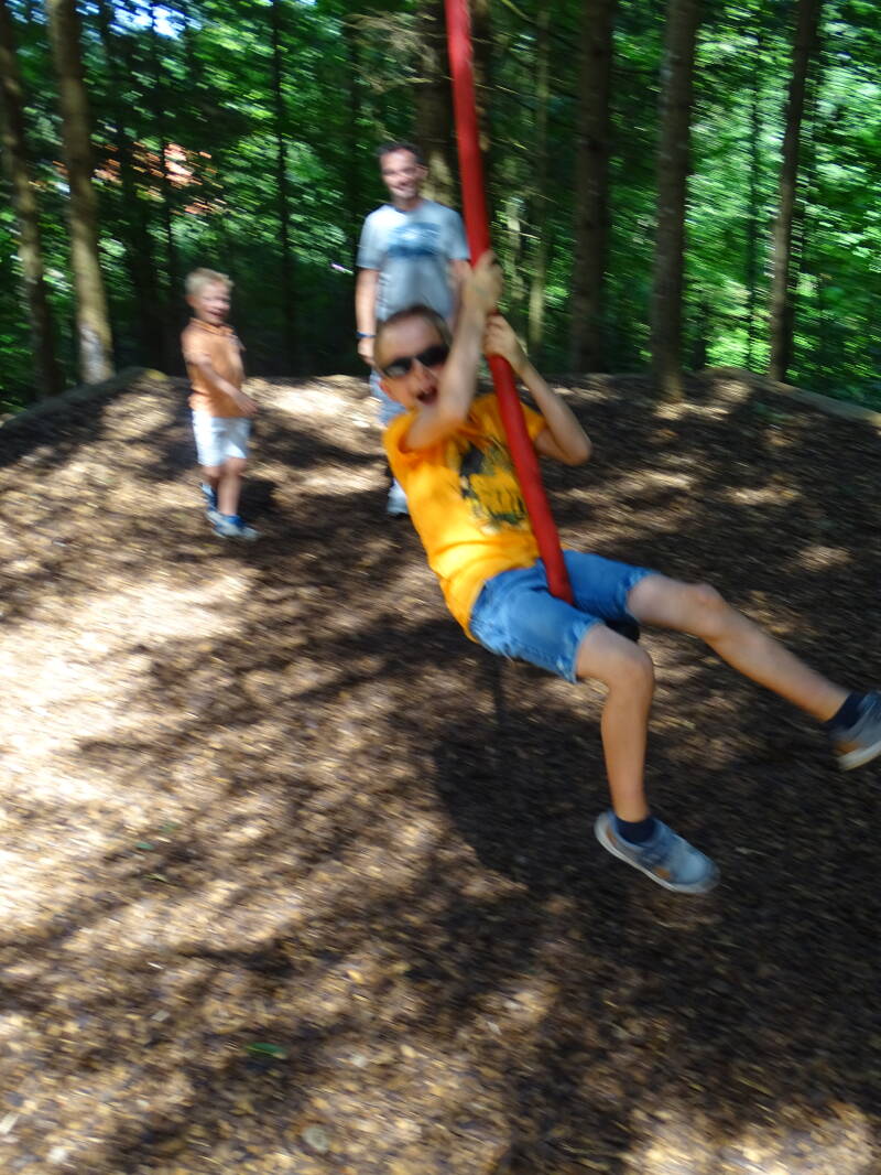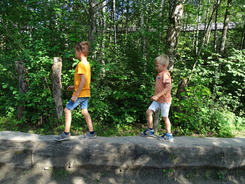 Het is een wandelingetje van enkele kilometers in het bos. We komen tal van didactische speelstations tegen. Tristan en Odin hebben kennelijk nog energie genoeg om te spelen ...