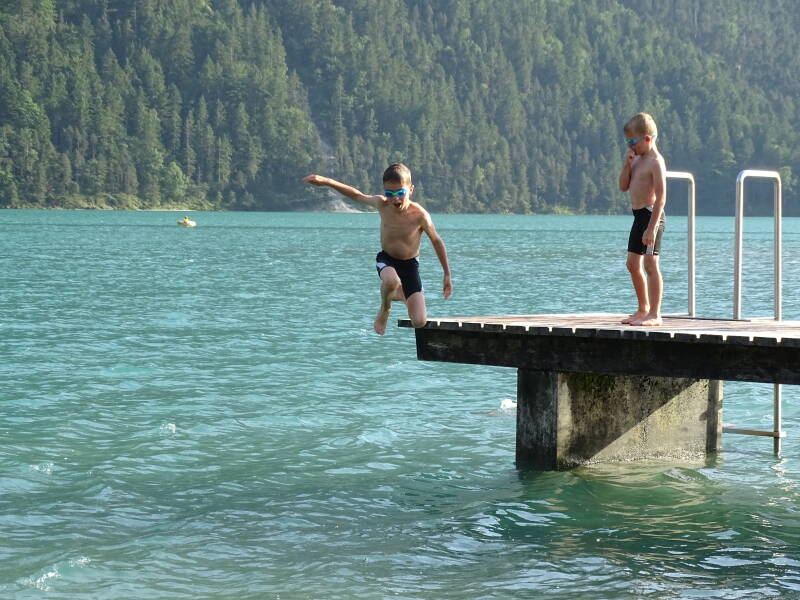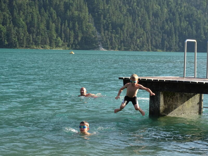 Ondertussen begint het vooravond te worden … tijd voor de laatste bestemming van onze voorlaatste dag : de 'Plansee'. Dit meer ligt temidden de bergen, en is een populaire bestemming. De zon tekent al gans de dag present, zodat Tristan en Odin het water kunnen induiken.