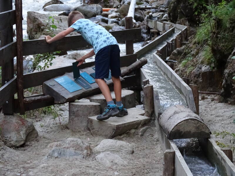 We steken de rivier over langs een houten brug, en komen te weten wat een 'waalweg' is, namelijk aftakkingen via houten gootjes van de rivier. Zo gebruikten de lokale boeren vroeger deze 'waalwegen' om hun akkers en velden te irrigeren. Voor is het echter leuk om zo de 'waalweg' te volgen door het bos terug naar Solden.
