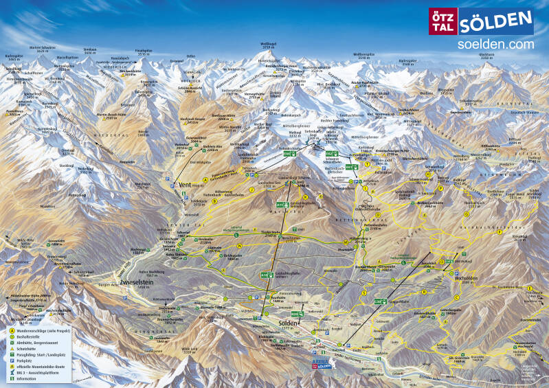 We nemen het tweede gedeelte van de 'Gaislachkogelbahn', en gaan nu naar 3040 meter hoogte. We zitten middenin het hooggebergte, met een panoramisch zicht op de tal van 'drieduizenders'. Het zicht is bijna niet te beschrijven ; overal zie je bergtoppen, sneeuw en talloze gletschers ...