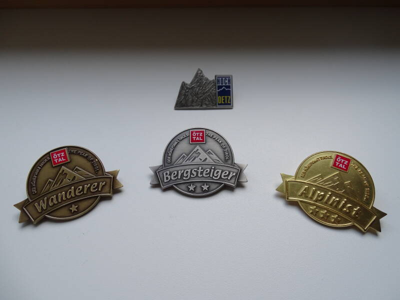 Er is echter ook een 'Wandernadel' te halen in 'Oetz', en gezien we hiervoor tijdens onze eerste wandeling rond 'Widiversum' punten genoeg hebben gehaald, scoren we nog de 'Hochoetzwandernadel'! We leggen hem bij de andere drie ..